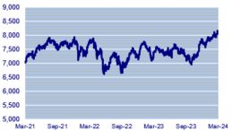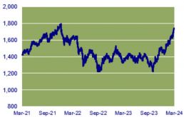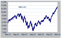 Equities markets rose strongly during the last 12 months, the MSCI (a global Index) was up 25.1% and 8.9% for the quarter ended 31 March 2024. Since the equities markets bottomed in September 2022, two and a half years ago, the MSCI has risen approximately 40%. Stock Indices returns over the last 12 months have varied widely: the Nasdaq and Philadelphia Semiconductor Index were up 34% and 51% respectively, the Japanese market was up 44% and the Australian Property index up 37%. European markets were up a modest 12% and the UK market a mere 4%. Not surprisingly the Chinese markets fell sharply, down close to 20%; declines have now been going on for four years in these markets, which is a long time in any market reflecting the severe problems in the real estate markets and concerns over Party involvement in the technology sector.