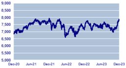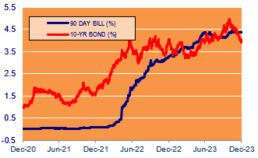 In the United States, the Federal Reserve has indicated that it thinks rates have peaked. At its last meeting of the year, the FOMC held the Federal Funds target unchanged at a range of 5.25-5.5%.
