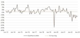 Clearly the market is still expecting more to come, as the sector as a whole continues to trade at a discount to their Net Asset Value (NAV) as the chart above suggests. However, all this could quickly change if slightly more positive news appears (i.e., stabilising/peaking of interest rate).